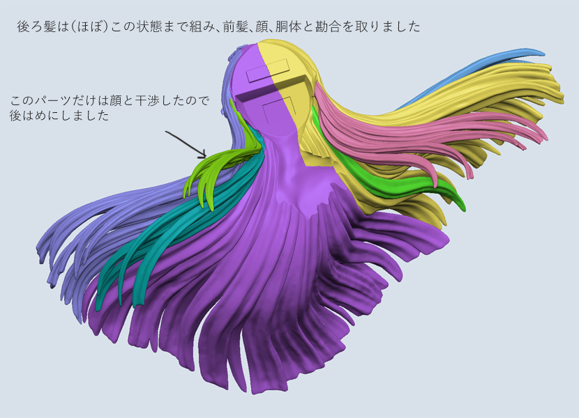 後ろ髪は下図まで組み上げ、顔、胴体、前髪と勘合を取り軸打ちしました。