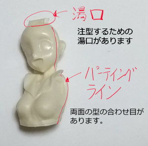 レジンキャストパーツには通常、湯口とパーティングラインがあります。