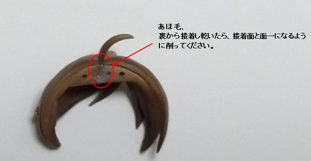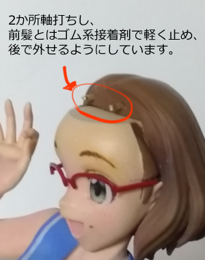前髪は軸打ちし、後から外せるようになっています。少量のゴム系接着剤で止めています。