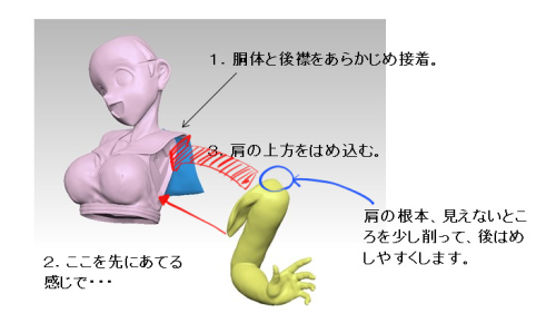 両腕は後はめできるようにし、組立は、わき部分を胴体に合わせて肩をはめ込む感じで行います。