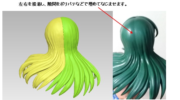 後ろ髪のパーツ、内側の表面処理が大変なので左右で分割しています。